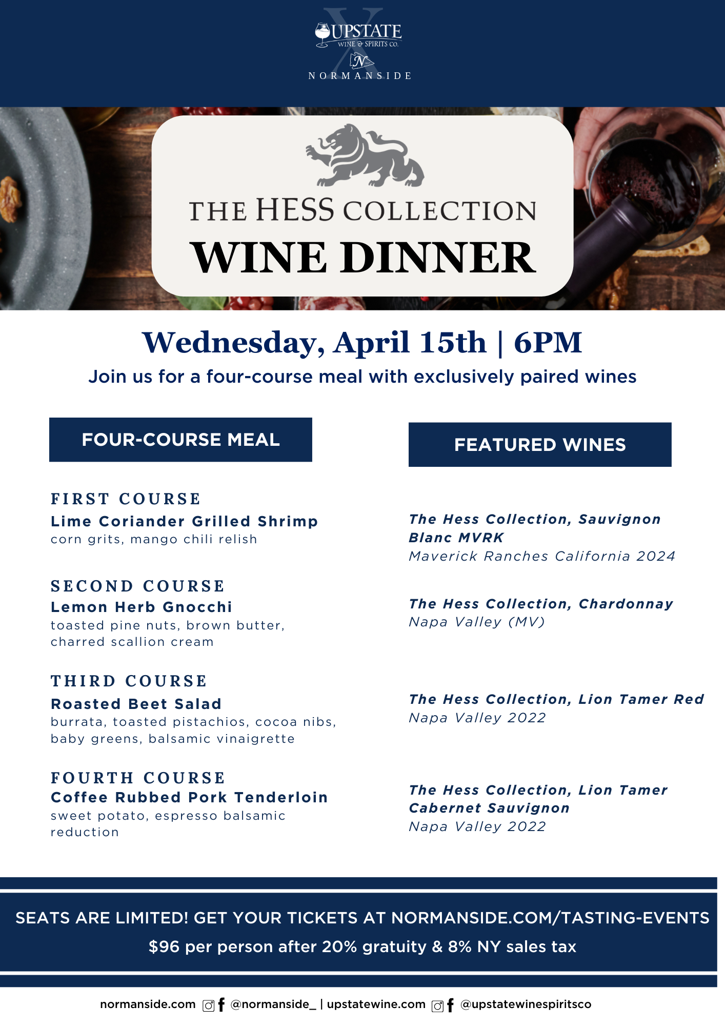Back to All Events Hess Wine Dinner Wednesday, April 15, 2026 6:00 PM 9:00 PM Normanside Country Club 150 Salisbury Road Delmar, NY, 12054 United States (map) Google Calendar ICS Join us on Wednesday, April 15th, for an exclusive Wine Dinner! Delicious wines from Hess paired with a four course meal. Get Tickets Wine Dinner Menu