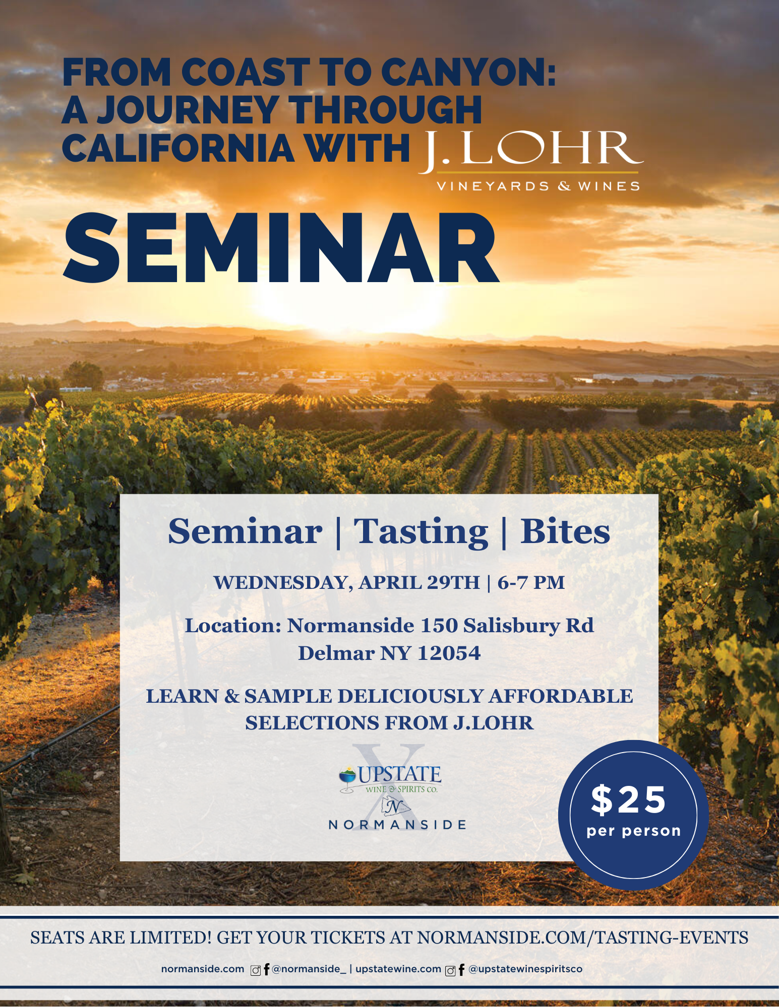 From Coast to Canyon: A Journey Through California with J.Lohr Wednesday, April 29, 2026 6:00 PM 7:00 PM Normanside Country Club 150 Salisbury Road Delmar, NY, 12054 United States (map) Google Calendar ICS Join us on Wednesday, April 29th, for an exclusive Wine Seminar! Get Tickets Wine Seminar Flyer